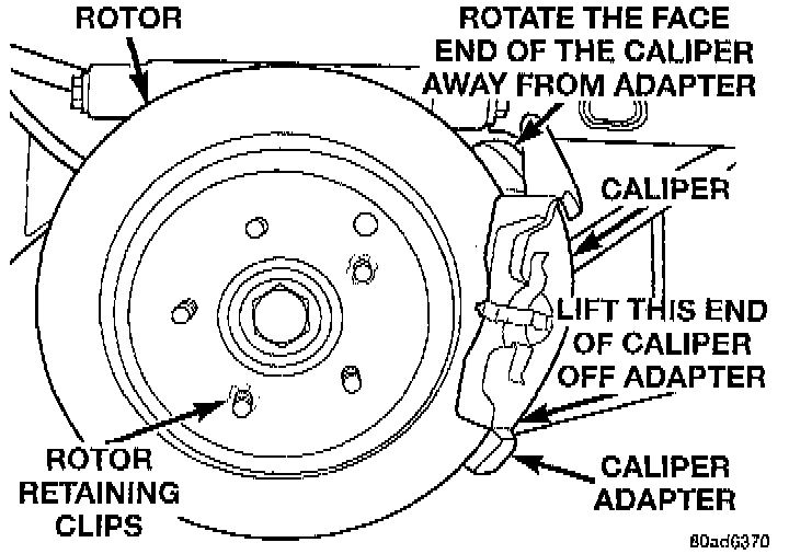 6. Remove the disc brake caliper from the caliper adapter. Caliper is removed by first rotating the free end of the caliper away from the caliper adapter. Then with the free end of the caliper rotated away from the adapter, lift the caliper off the machined abutment on the adapter.