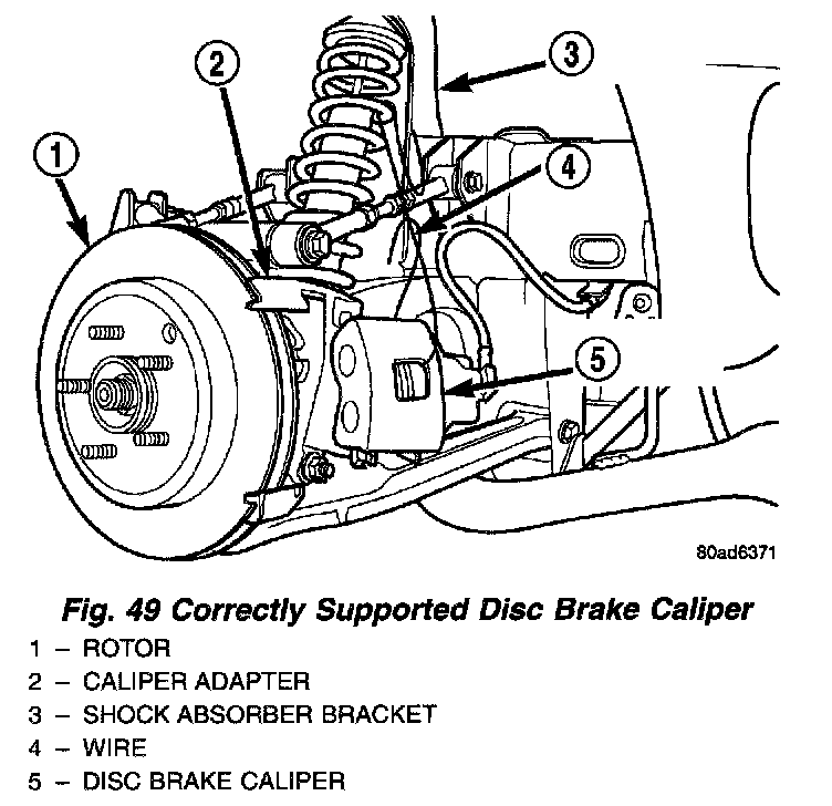7. Support the disc brake caliper by hanging it from the shock absorber bracket on the flame rising wire or a tie strap. Do not let the flex hose support the weight of the brake caliper, damage to the flex hose can occur.