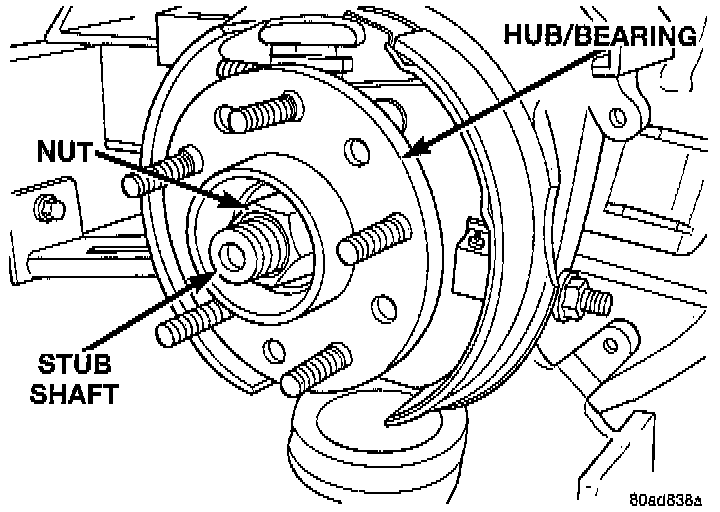 2. With the weight of the vehicle supported by the tires and the parking brake applied, loosen hut do not remove the stub shaft to hub bearing nut.