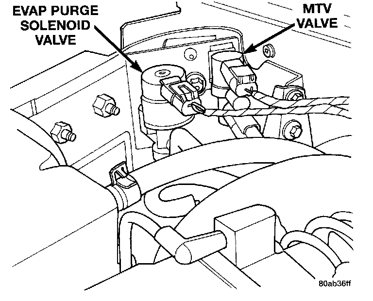The EVAP purge solenoid and bracket attach to the right inner fender well next to the dash panel. The top of the solenoid has the word TOP on it. The solenoid will not operate unless it is installed correctly. If the vehicle has a 3.5L engine, the EVAP purge solenoid shares a bracket with the MTV solenoid.