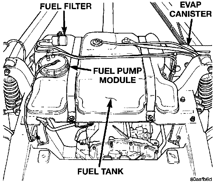 The fuel tank is located between frame rails at the rear of the vehicle.