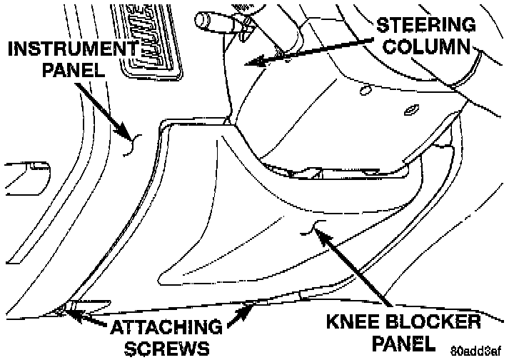 3. Remove the 2 screws mounting the steering column opening trim panel to the lower instrument panel. Unclip the 2 retaining clips holding the top edge of the trim panel to instrument panel. Remove the steering column opening trim panel from the lower instrument panel.