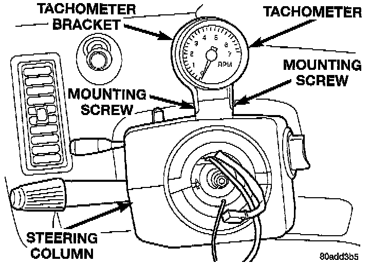 10. Remove tachometer from steering column. Remove tachometer by taking out the 2 screws mounting the tachometer bracket to the bracket on the steering column. Unplug wiring harness from tachometer.