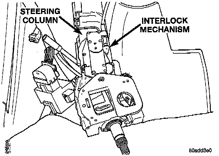 25. Remove shifter interlock mechanism from steering column. Shifter interlock mechanism is removed by taking out the 2 mounting screws and lifting the mechanism off the steering column.