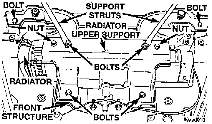 23. Loosely install the bolts mounting the Support struts to the radiator upper Support.