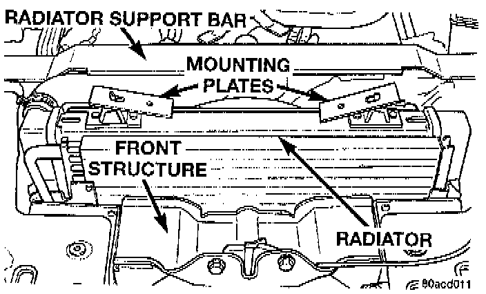 21. Install the 2 mounting plates on the radiator upper mounting brackets. The mounting plates are to be installed with the weld nuts facing inward. The weld nuts must line up with the support Strut mounting holes in the radiator upper support.