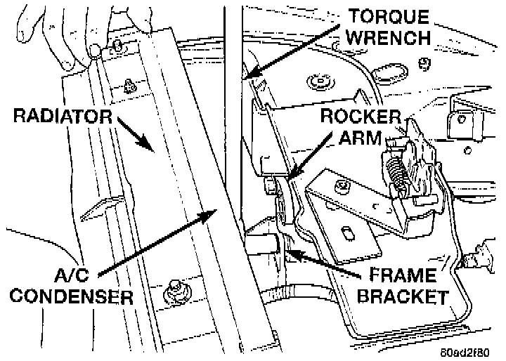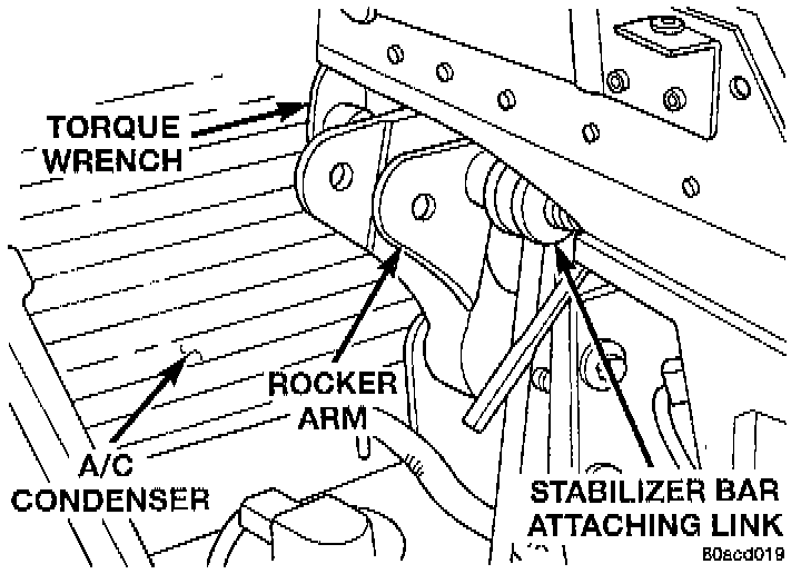 CAUTION: Access to the stabilizer bar attaching link bolt and rocker arm mounting bolt for torquing, is from the back side of the rocker arm. Between the rocker arm and A/C condenser. Extreme care must be used so the condenser is not damaged when torquing bolts.