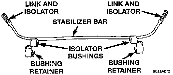 The rear stabilizer bar is attached to the frame of the vehicle in two locations. The stabilizer bar is mounted to and isolated from the frame using two replaceable rubber isolator bushings and bushing retainers. Attachment of the stabilizer bar to the lower control arms is done using a link and isolator at the stabilizer bar to real lower control arm mounting locations.