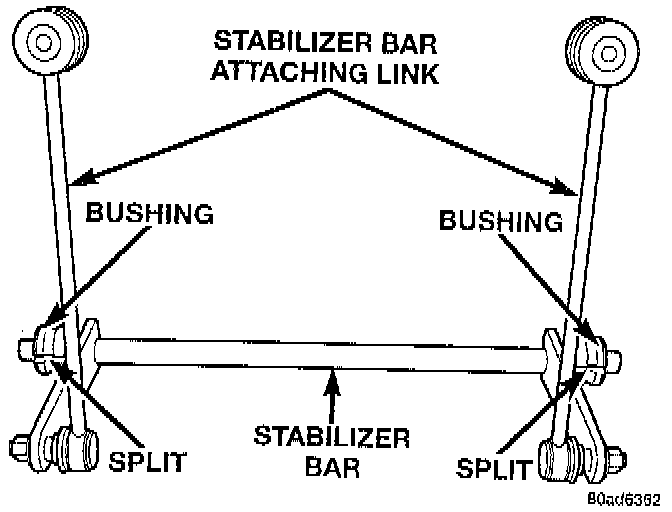 Inspect for broken or distorted clamps, retainers, and bushings. If bushing replacement is required, the bushing can be removed by opening split in bushing and removing it from the stabilizer bar. Inspect stabilizer bar attaching links for bending, seal leakage, ball joint free play or any other signs of damage.