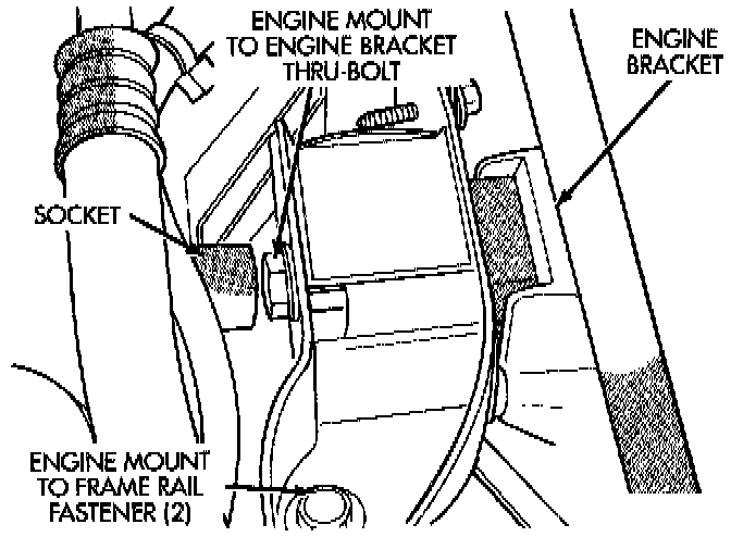 5. Reverse removal procedure for installation. Tighten engine mount to rail fasteners to 54 Nm (40 ft. lbs.), then tighten engine mount to engine bracket thru-bolt to 108 Nm (80 ft. lbs.).