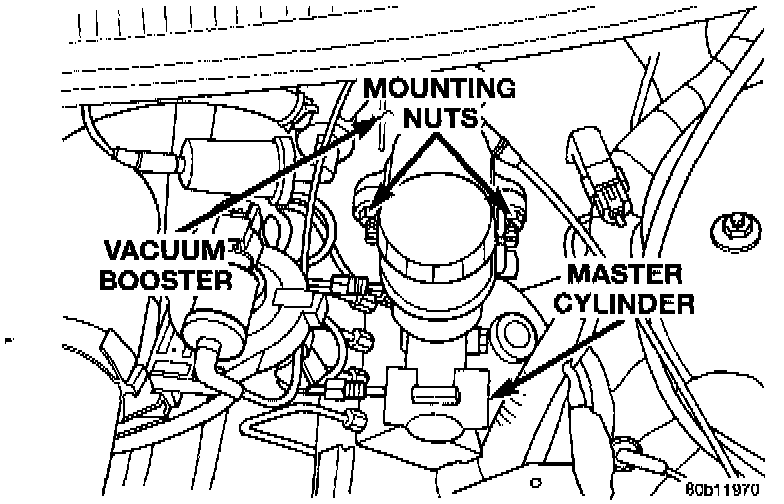 CAUTION: On ABS equipped vehicles, vacuum in power booster must be pumped down before removing master cylinder to prevent the booster from sucking in any contamination. This can be done simply by pumping the brake pedal, with the engine not running, until a firm brake pedal is achieved.