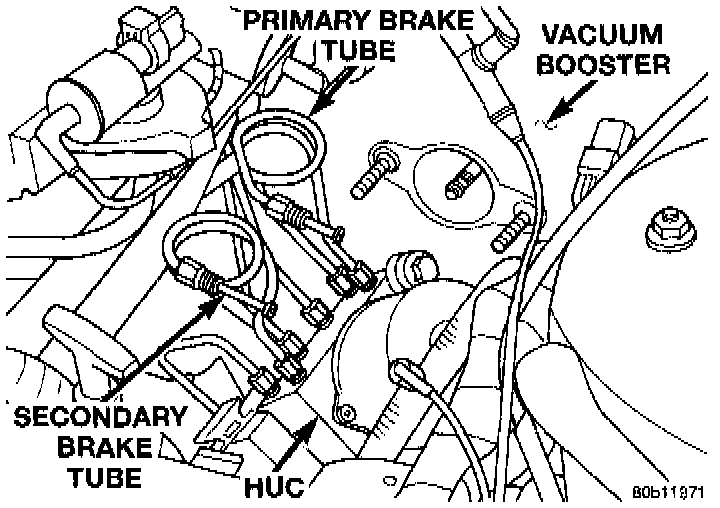 12. Remove the primary and secondary master cylinder brake tubes from the inlet ports of the Hydraulic Control Unit (HCU).