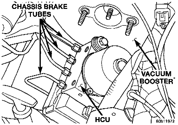 13. Remove the 4 chassis brake tubes from the outlet ports of the HCU.