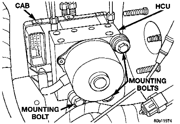 15. Remove the 3 bolts attaching the CAB and HCU to the mounting bracket.