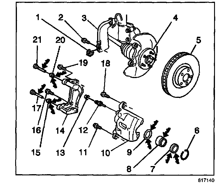 3. Remove the brake caliper and the caliper mounting bracket (14) as an assembly from the suspension knuckle and support the assembly with heavy mechanics wire, or equivalent. Verify that there is no tension on the hydraulic brake flexible hose. Refer to Brake Caliper Bracket Replacement - Front.