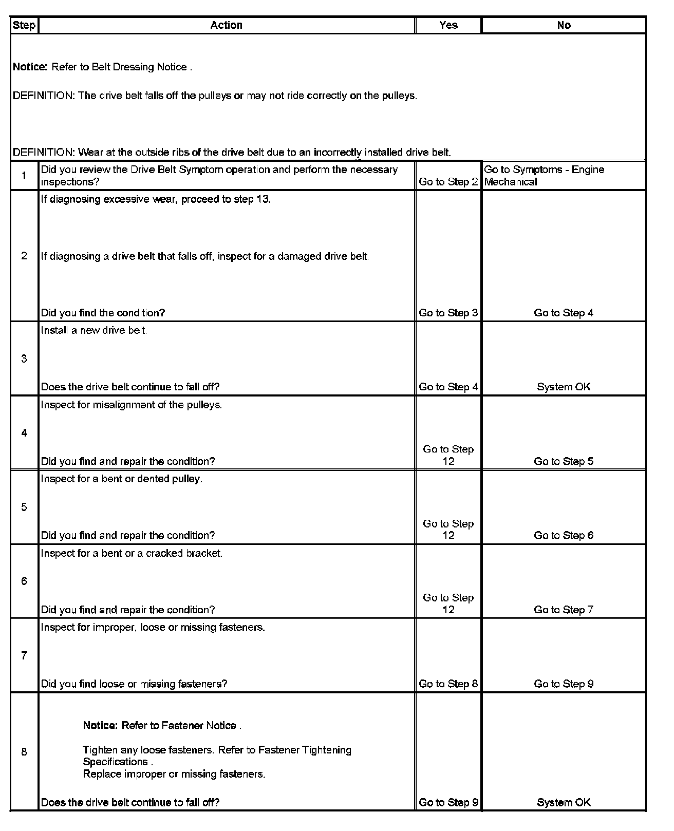 2. This inspection is to verify the condition of the drive belt. Damage may of occurred to the drive belt when the drive belt fell off. The drive belt may of been damaged, which caused the drive belt to fall off. Inspect the belt for cuts, tears, sections of ribs missing, or damaged belt plys.