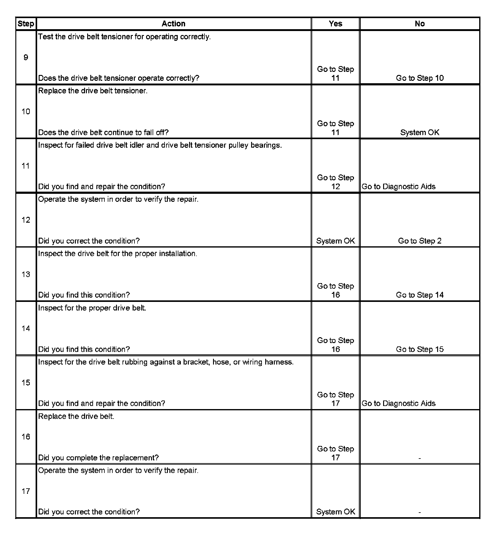 An extra load that is quickly applied on released by an accessory drive component may cause the drive belt to fall off the pulleys. Verify the accessory drive components operate properly.