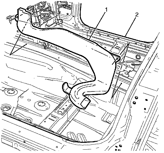 Important: Using a suitable tool, pry the rear floor air outlet duct to floor retaining clips (1).