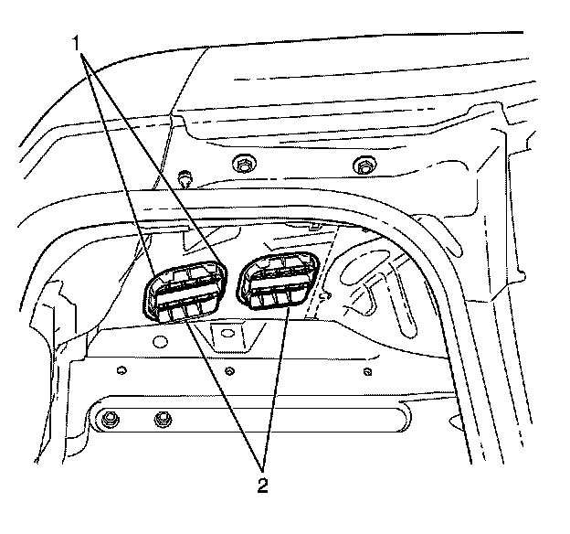 6. From inside the rear compartment, press the retaining tabs (1) while pushing outward in order to release the pressure relief valve (2) from the rear quarter panel.