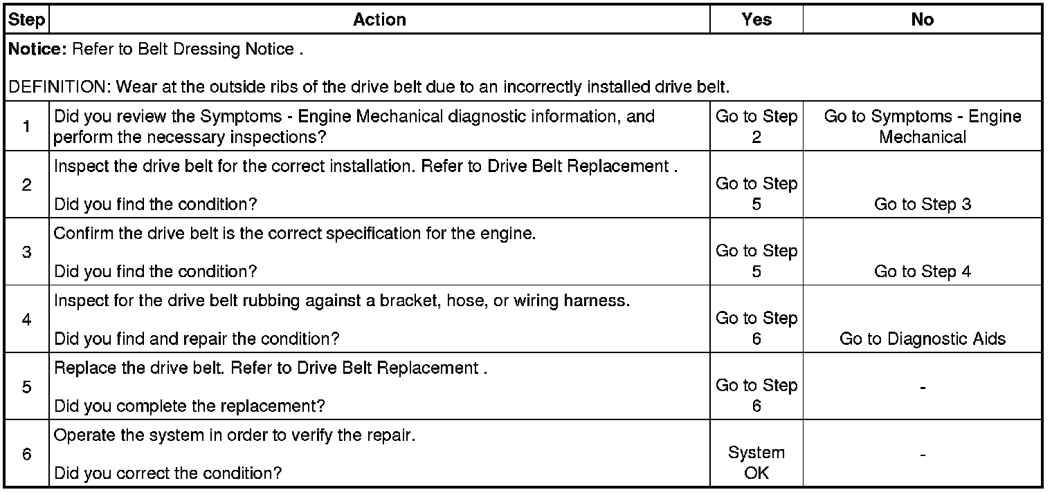 2. The inspection is to verify the drive belt is correctly installed on all of the drive belt pulleys. Wear on the drive belt may be caused by miss-positioning the drive belt by one groove on a pulley.