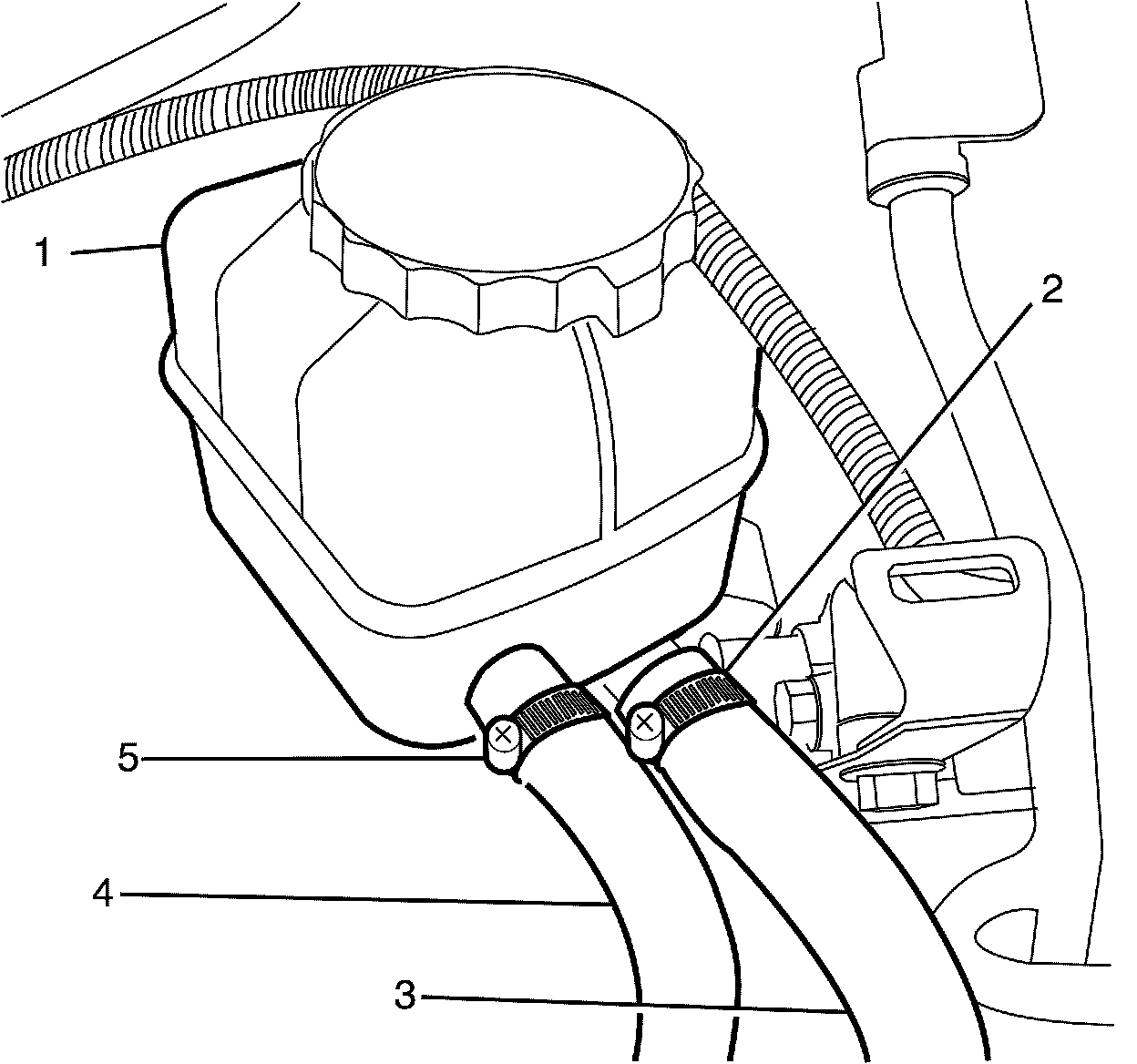 6. Release the power steering fluid reservoir inlet pipe/hose spring clamp (5) and connect the power steering fluid reservoir inlet pipe/hose (3) to the power steering reservoir (1).