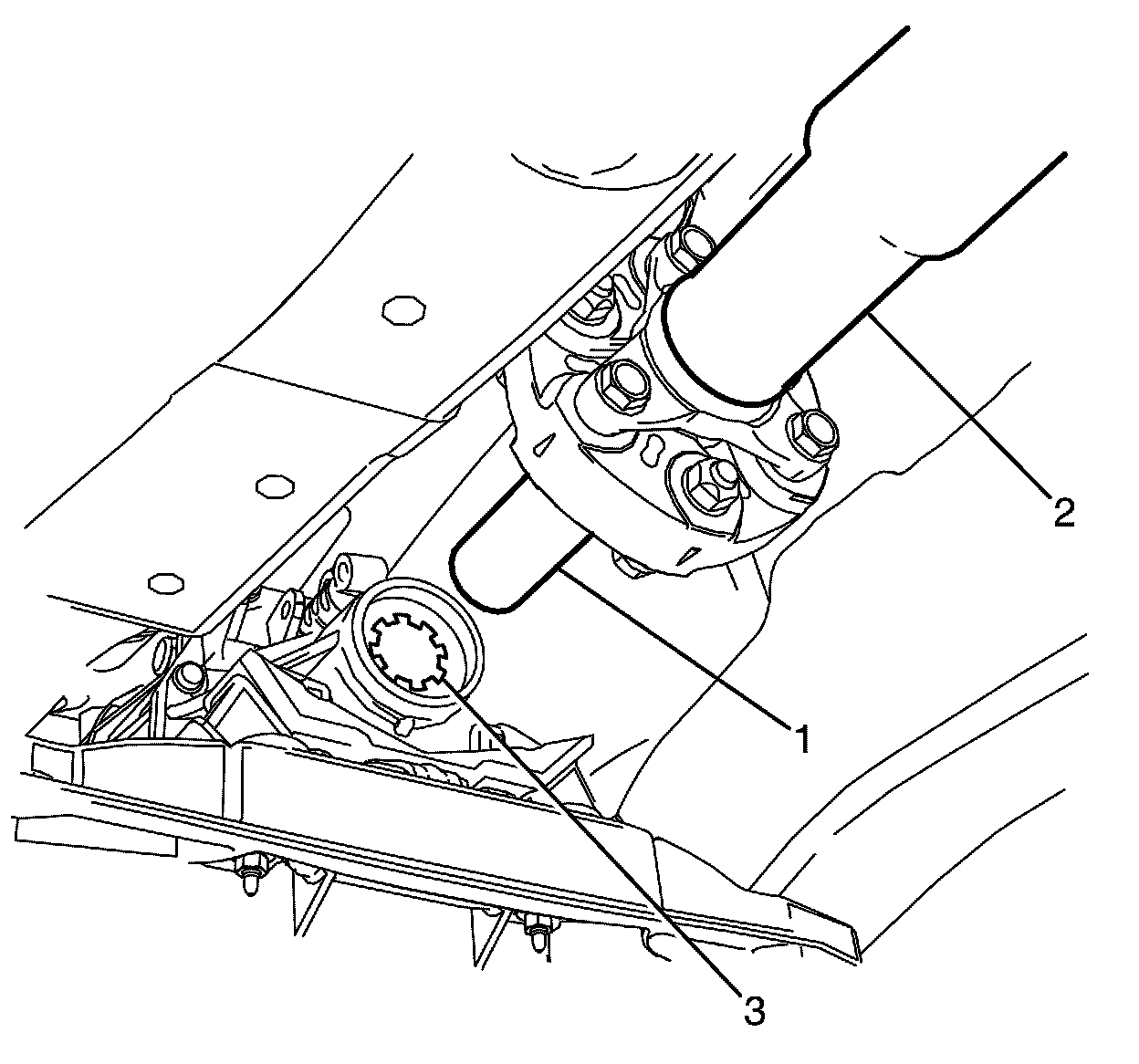 Important: Support the propeller shaft front yoke (1) and move the propeller shaft (2) rearward to disconnect the propeller shaft front yoke (1) from the transmission shaft splines (3).