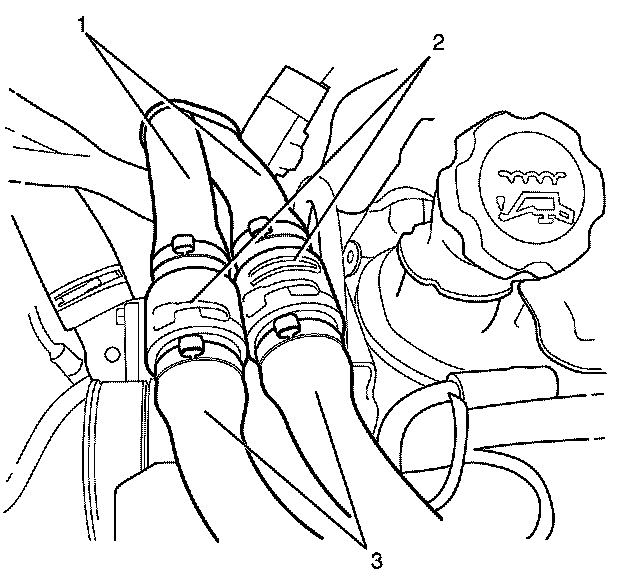 3. Using J 38185 compress the heater hose retaining clamps (1) and slide along the heater hoses (3).