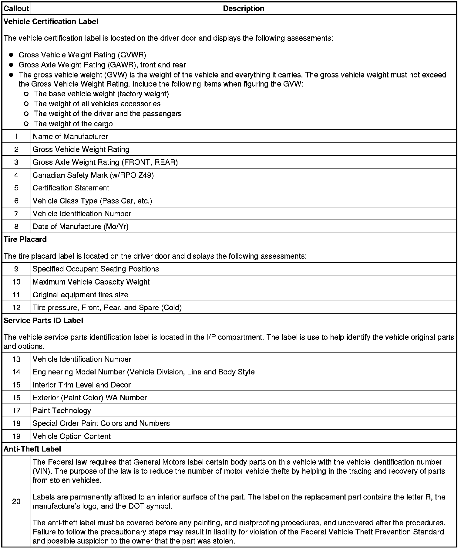 Vehicle Certification, Tire Placard, Anti-Theft, and Service Parts ID Label