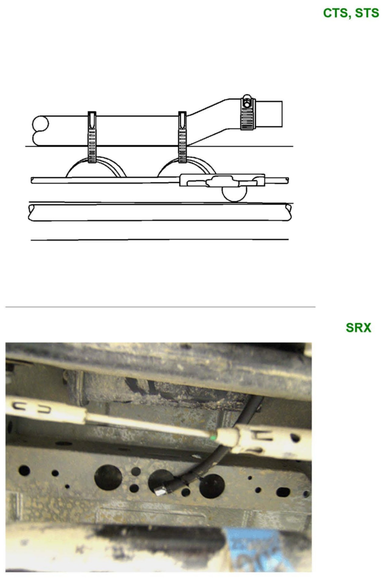 Tie strap the hose and vent assembly (referring to the graphic above, depending on the vehicle model). The CTS and STS should be strapped to the rear crossmember frame. The SRX should be strapped to the underbody sheet metal reinforcement.