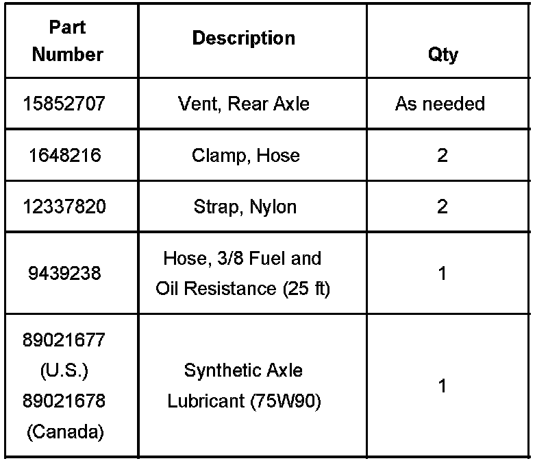 Obtain a 9.50 mm (3/8 in) inside diameter hose by 30.50 cm (12 in) long of rubber low fuel pressure/oil resistant hose or equivalent, a new differential vent, P/N 15852707, and two hose clamps.