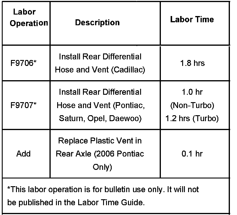 Some 2006 Pontiac Solstice models may have a plastic-style rear differential vent in the axle assembly. The plastic vent will need to be replaced with the new style metal vent, P/N 15852707.
