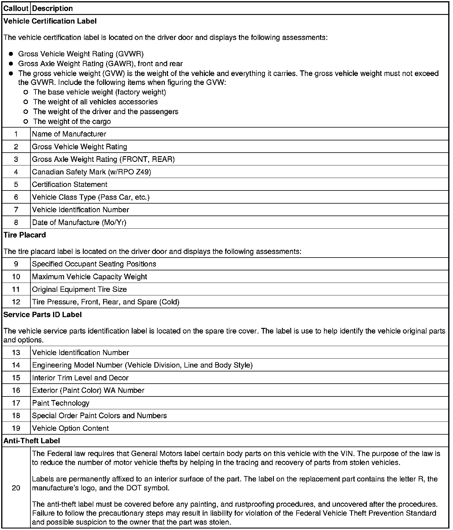 Vehicle Certification, Tire Placard, Anti-Theft, and Service Parts ID Label