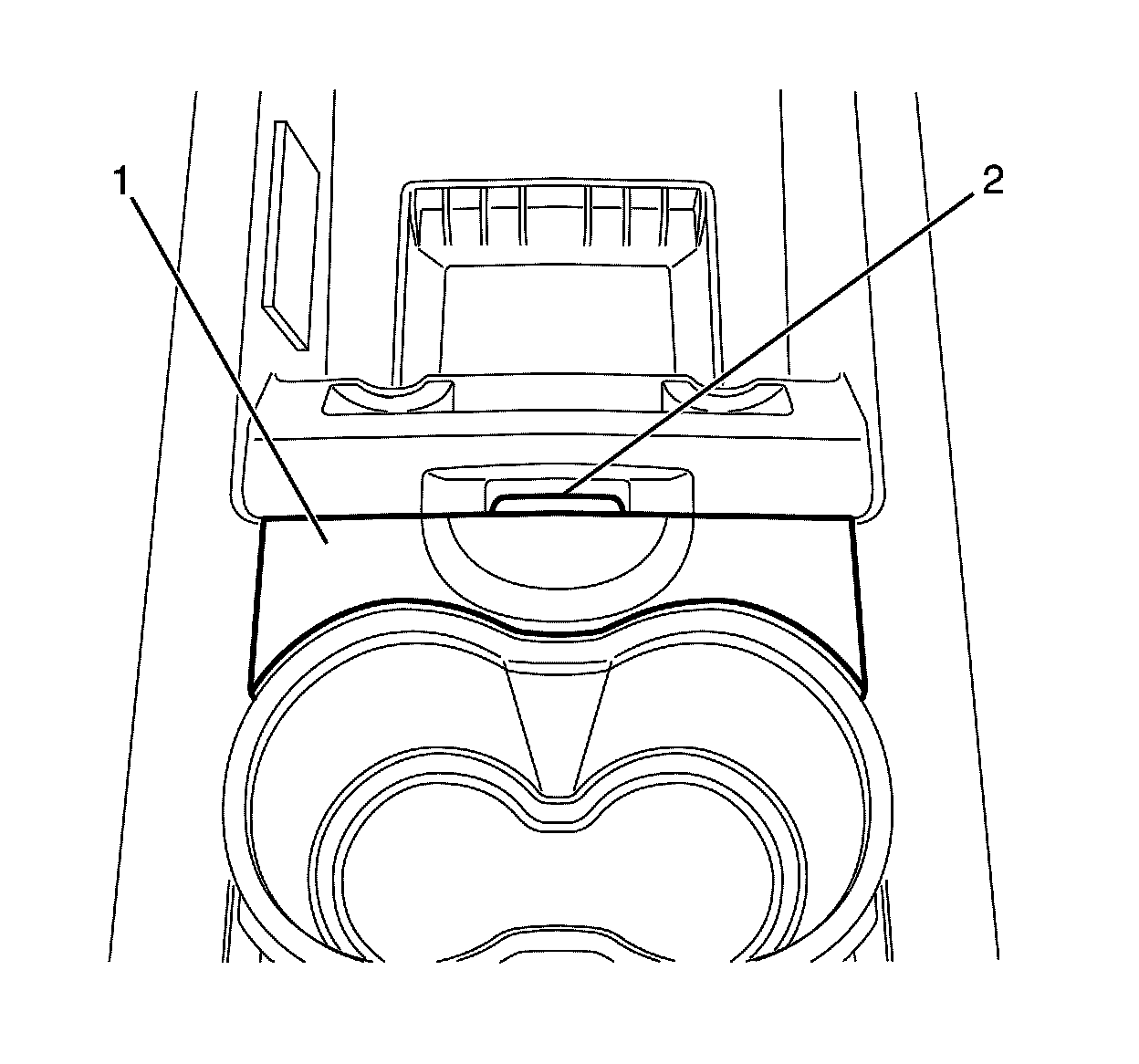 Note: The park brake cable adjustment bolt cover trim (1) is retained by 2 clips. Gently pry upwards with fingers at the front floor console armrest latch (2) to remove.