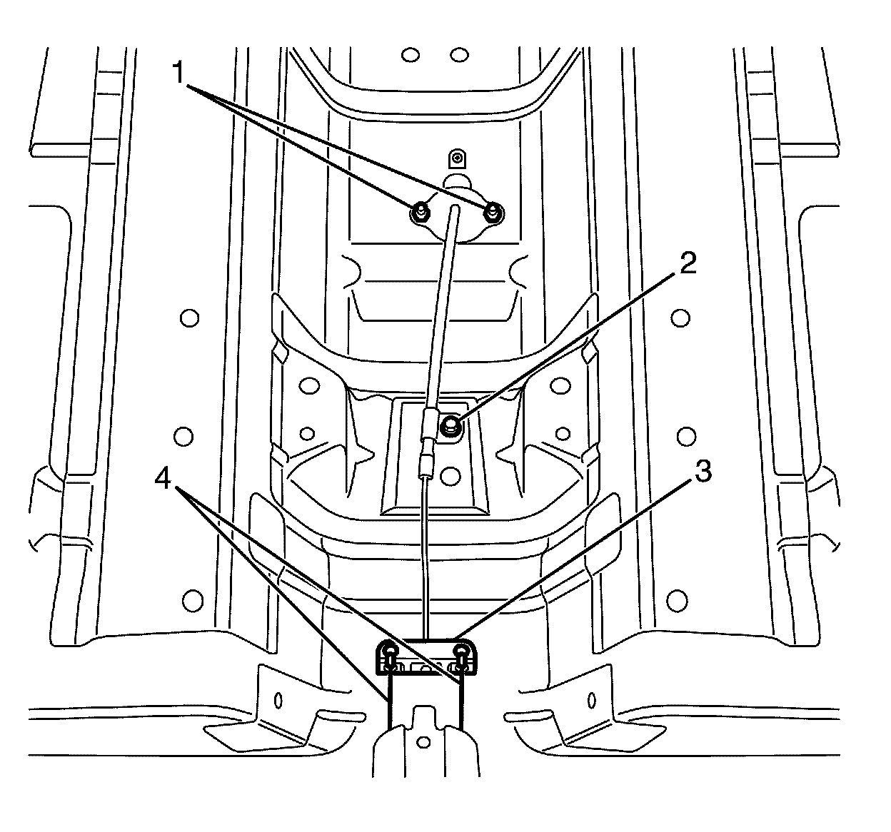 6. Install the front park brake cable rear bracket to vehicle underbody retaining bolt (2) and tighten to 22 Nm (16 lb ft).