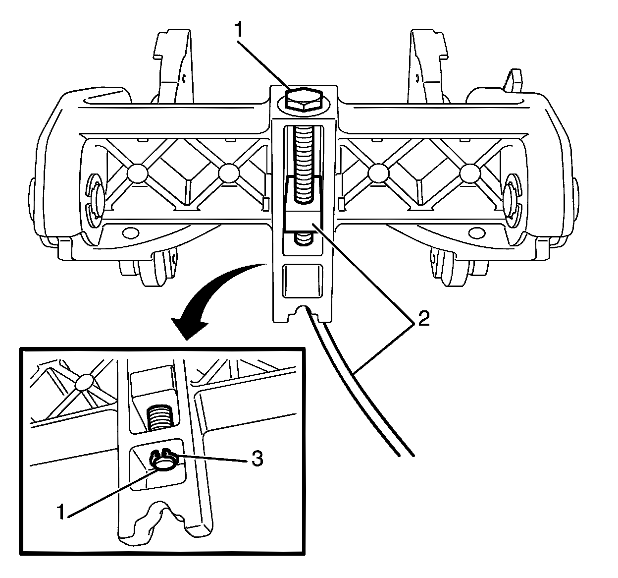 3. Install the park brake cable adjustment bolt to park brake assembly retaining circlip (3).