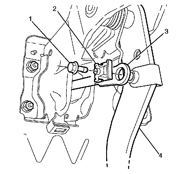 2. Install the brake pedal push rod (3), clip (2) and brake pedal push rod retaining bolt (1) to the brake pedal (4).