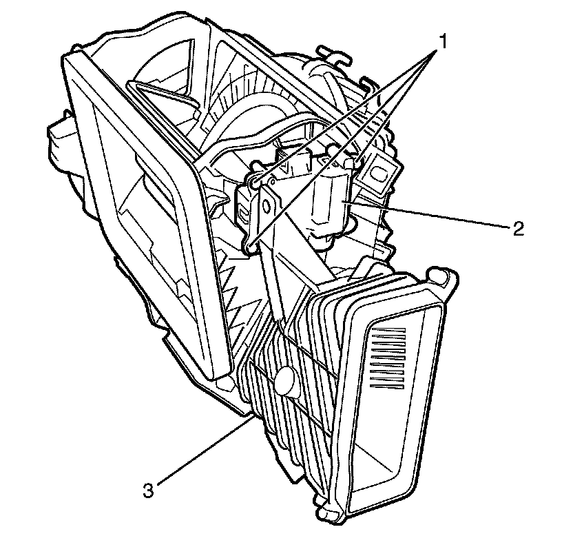 2. Remove the recirculation actuator to air inlet assembly retaining screws (1).