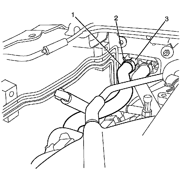 Note: Using a suitable tool, detach the heater outlet hose (1) by releasing the heater outlet hose quick connect fitting retaining clip (3).