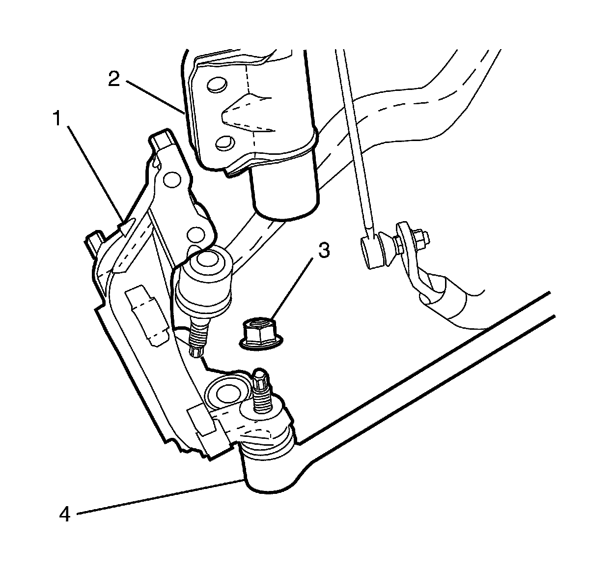 Note: The steering knuckle (3) to strut assembly retaining bolts (2), nuts (4) and washers (1) are not to be fully tightened at this stage.