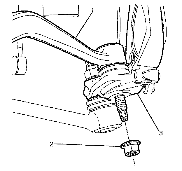 15. Using J-42188-B (1) disconnect the control arm (2) from the steering knuckle (3).