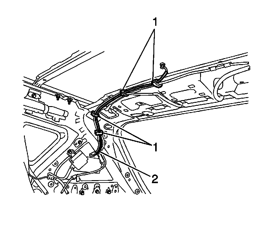 6. Remove the antenna wire (2) from the four clips (1).