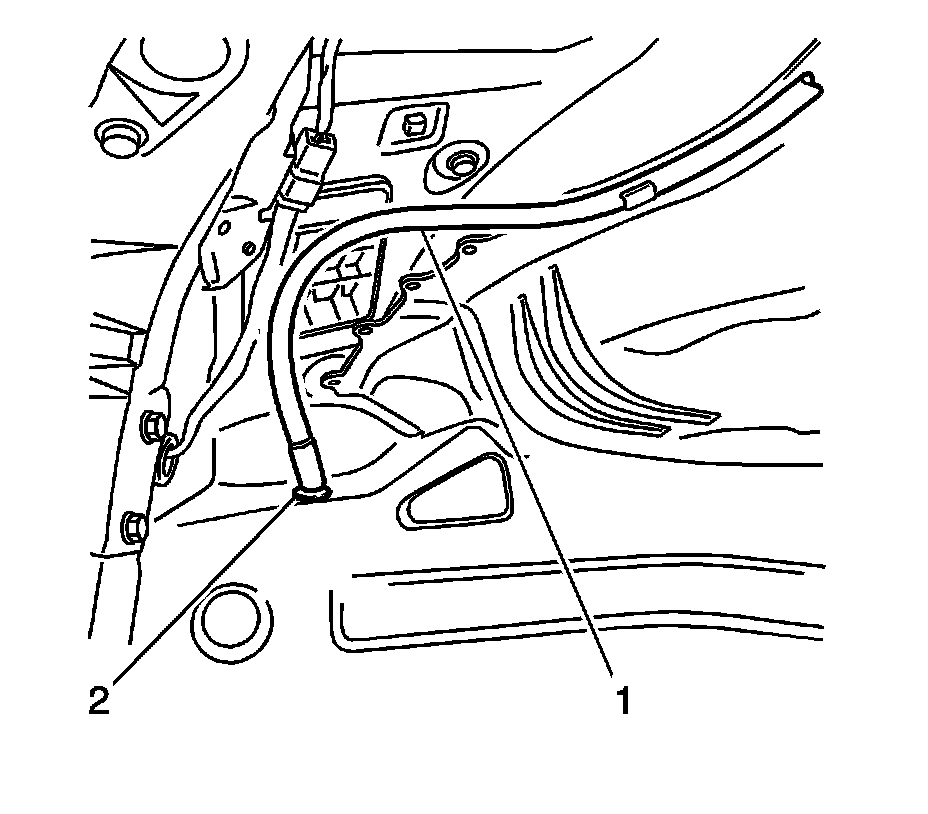 6. Remove the sunroof rear drain hose grommet (2) from the rear compartment floor pan.