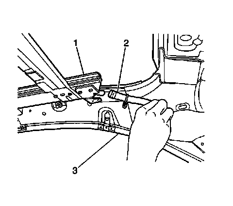 1. Install the sunroof housing front drain hose (2) to the vehicle, by routing the hose down through the body hinge pillar panel (3).