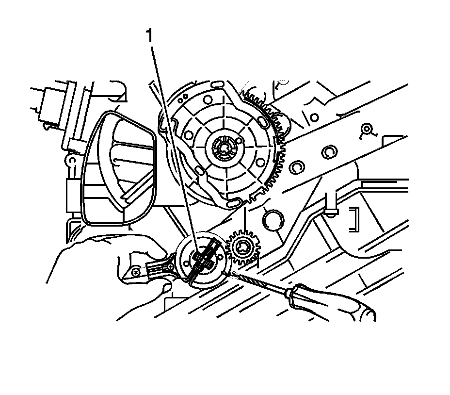 2. Using a taped flat-bladed tool, disengage the clip and disconnect the temperature control cable (1) from the HVAC module assembly.