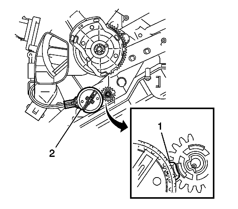 2. Position the gear (1) of the temperature control cable and connect the temperature control cable (2) to the HVAC module assembly.