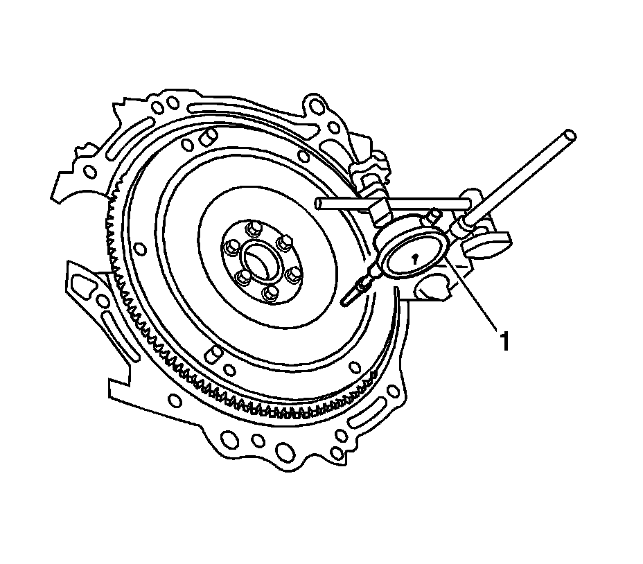 14. Using a dial indicator (1), measure the flywheel sub-assembly runout.