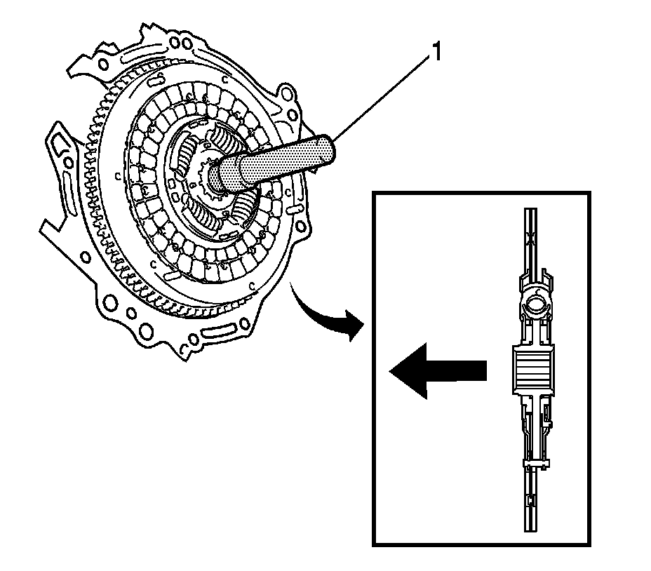 1. Insert a clutch pilot tool (1) into the clutch disc assembly, then insert them both into the flywheel sub-assembly.
