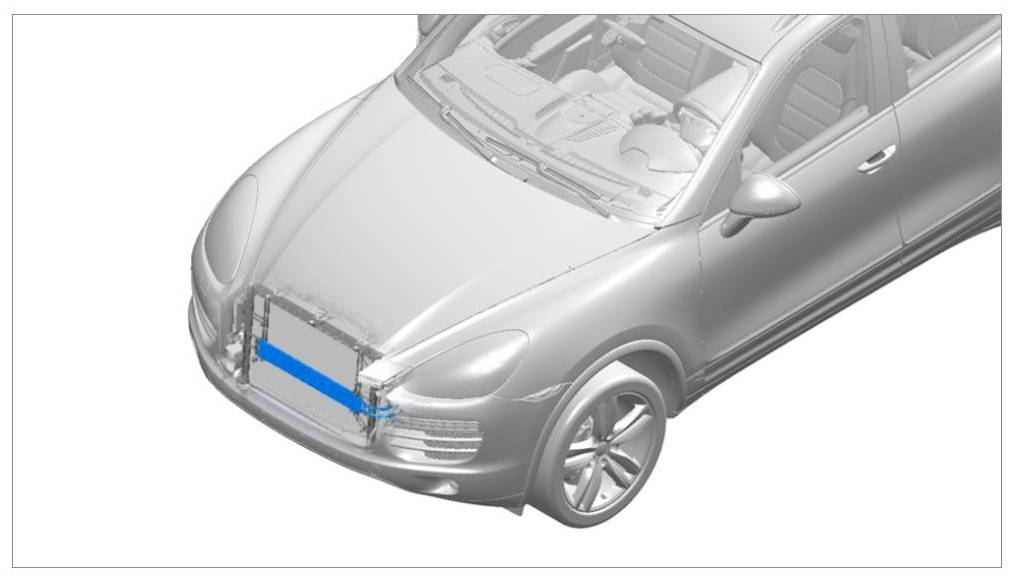 The power-steering cooler is located at the radiator module (water cooler, condenser, automatic transmission oil cooler, power-steering cooler), behind the front apron.