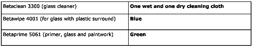 6. Carefully wash the edges of the window with Betawipe 3300. Carefully wipe the edges using the wet cleaning cloth. Dry with the dry cleaning cloth provided in the adhesive kit. Avoid touching the cleaned surface.