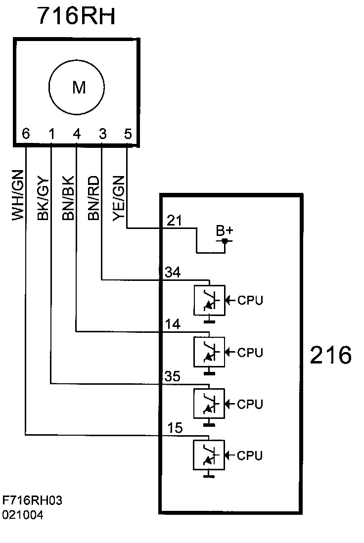 The four stepping motor windings receive a common B+ feed from ACC unit pin 21 (K42) and grounds each corresponding winding (pin 15, 35, 14 and 34 in K42) in a specific order thus operating the motor in short pulses, which explains the name stepping motor. The rotational direction can be changed.
